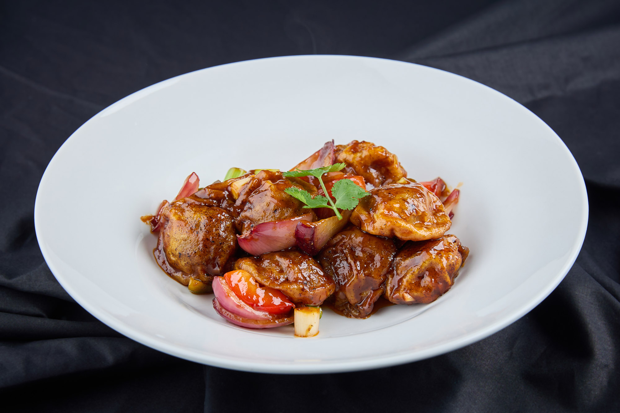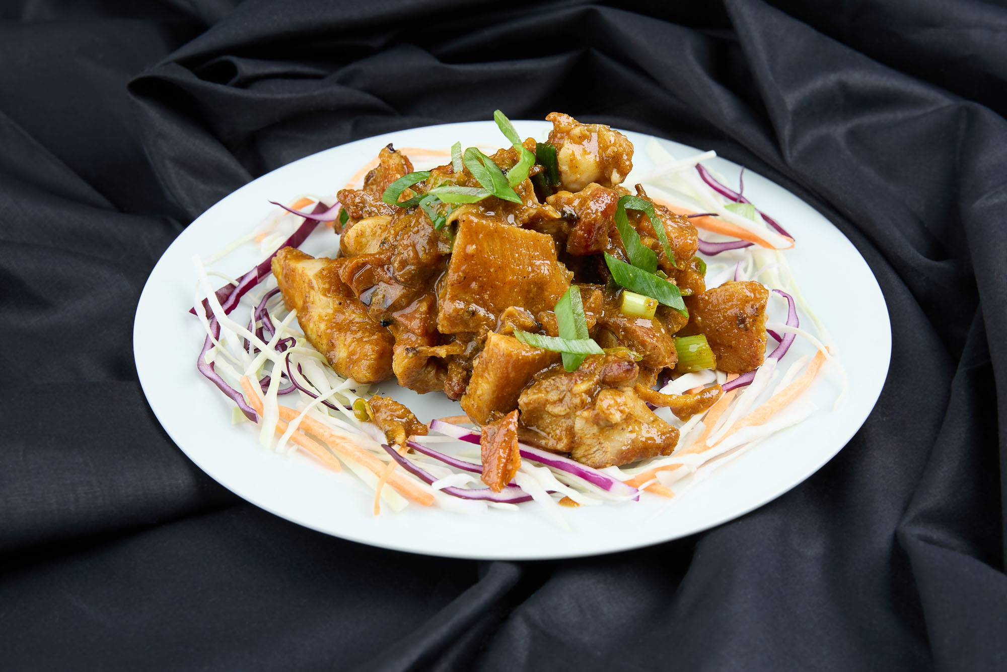 Bucăți de carne de porc prăjite rapid la foc mare, alături de legume și condimente orientale. Gustul sărat și ușor afumat face din acest preparat o alegere excelentă pentru iubitorii de mâncăruri consistente și aromate.