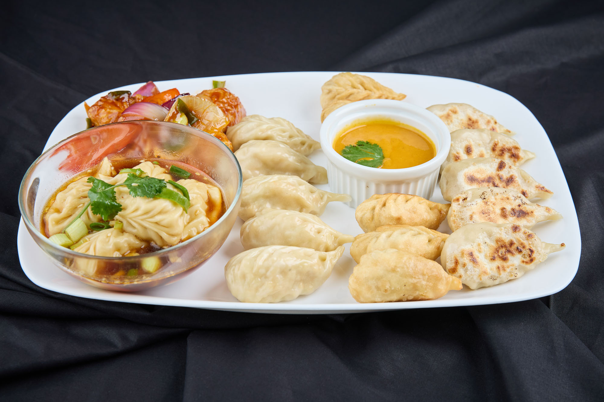Un platou complet dedicat pasionaților de momo: steamed, fried, kothey, chilli momo și keema soup.O incursiune în toate aromele Nepalului, într-o singură farfurie.