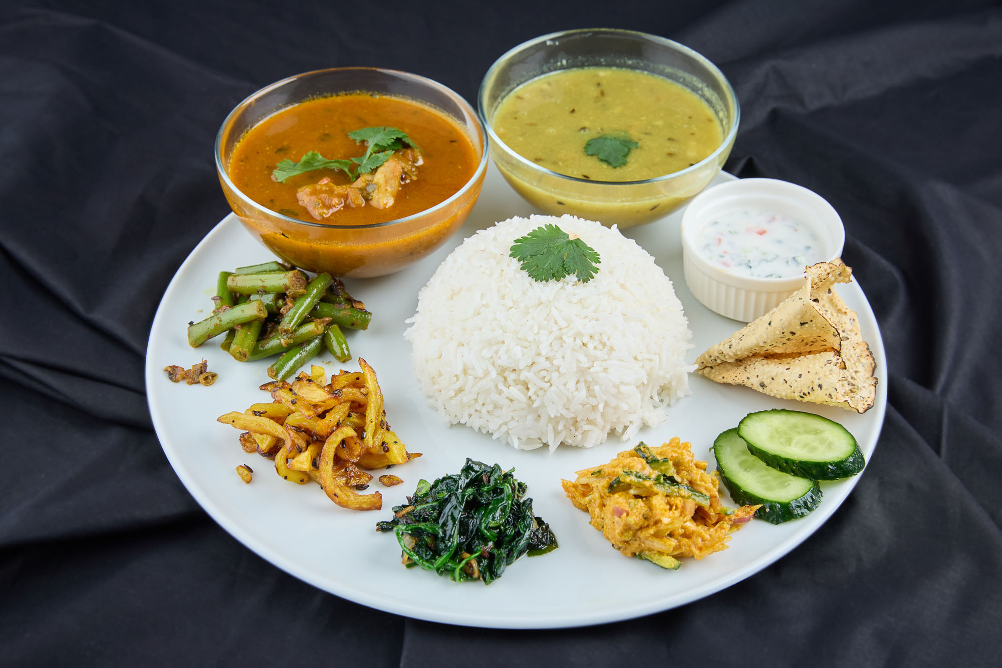 Simbolul ospitalității nepaleze. Un platou complet care adună tot ce e mai bun din bucătăria locală. O alegere ușoară, plină de prospețime și culoare.